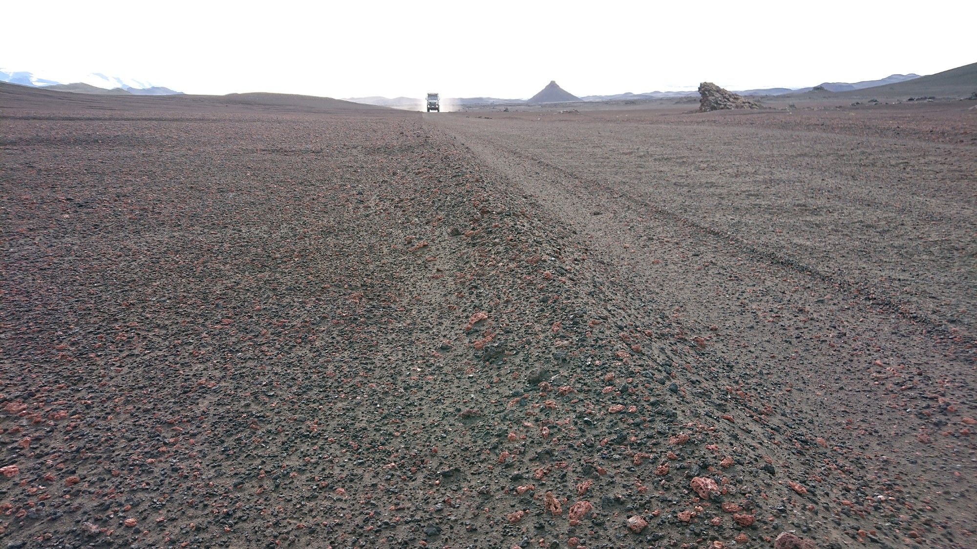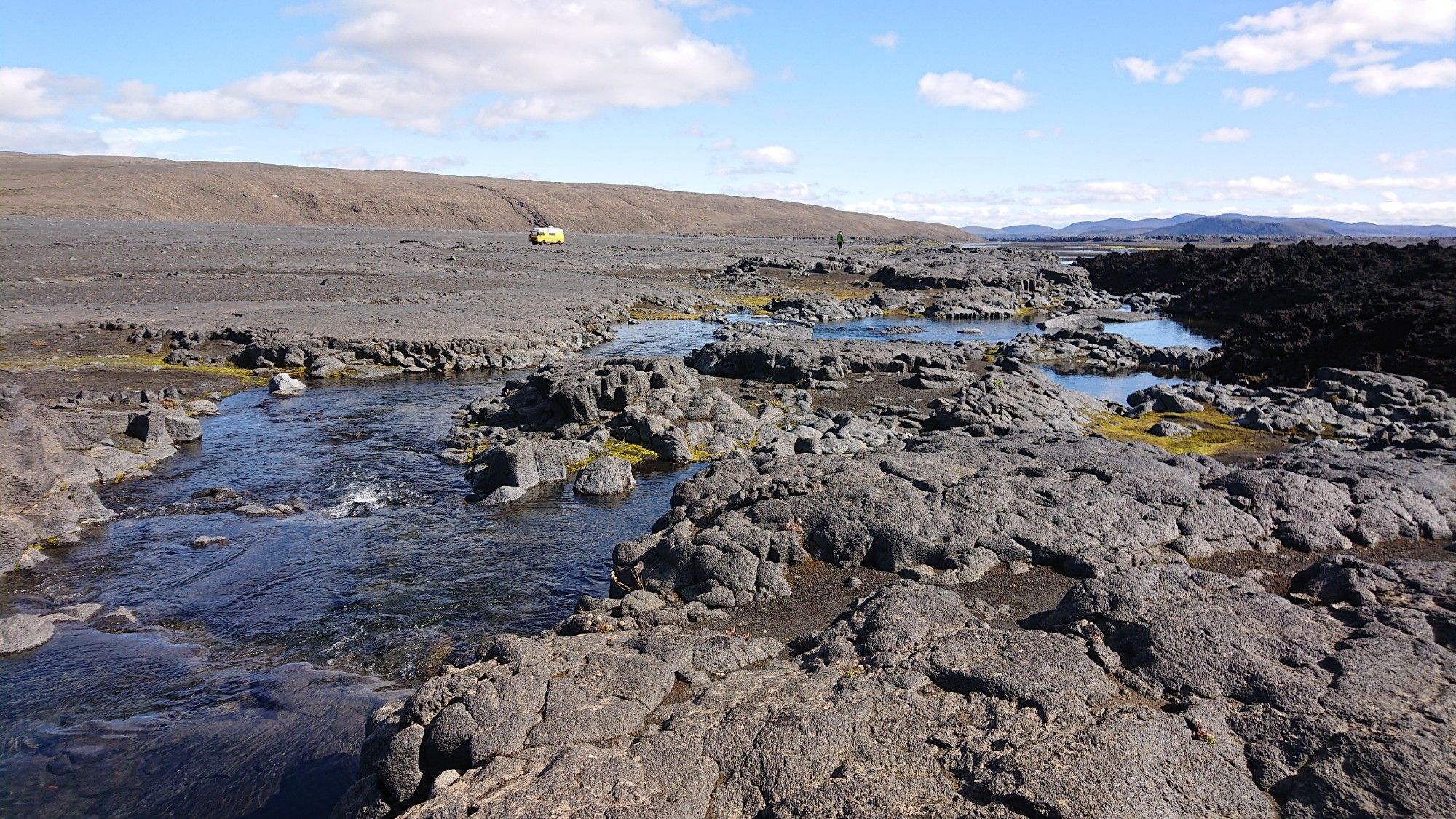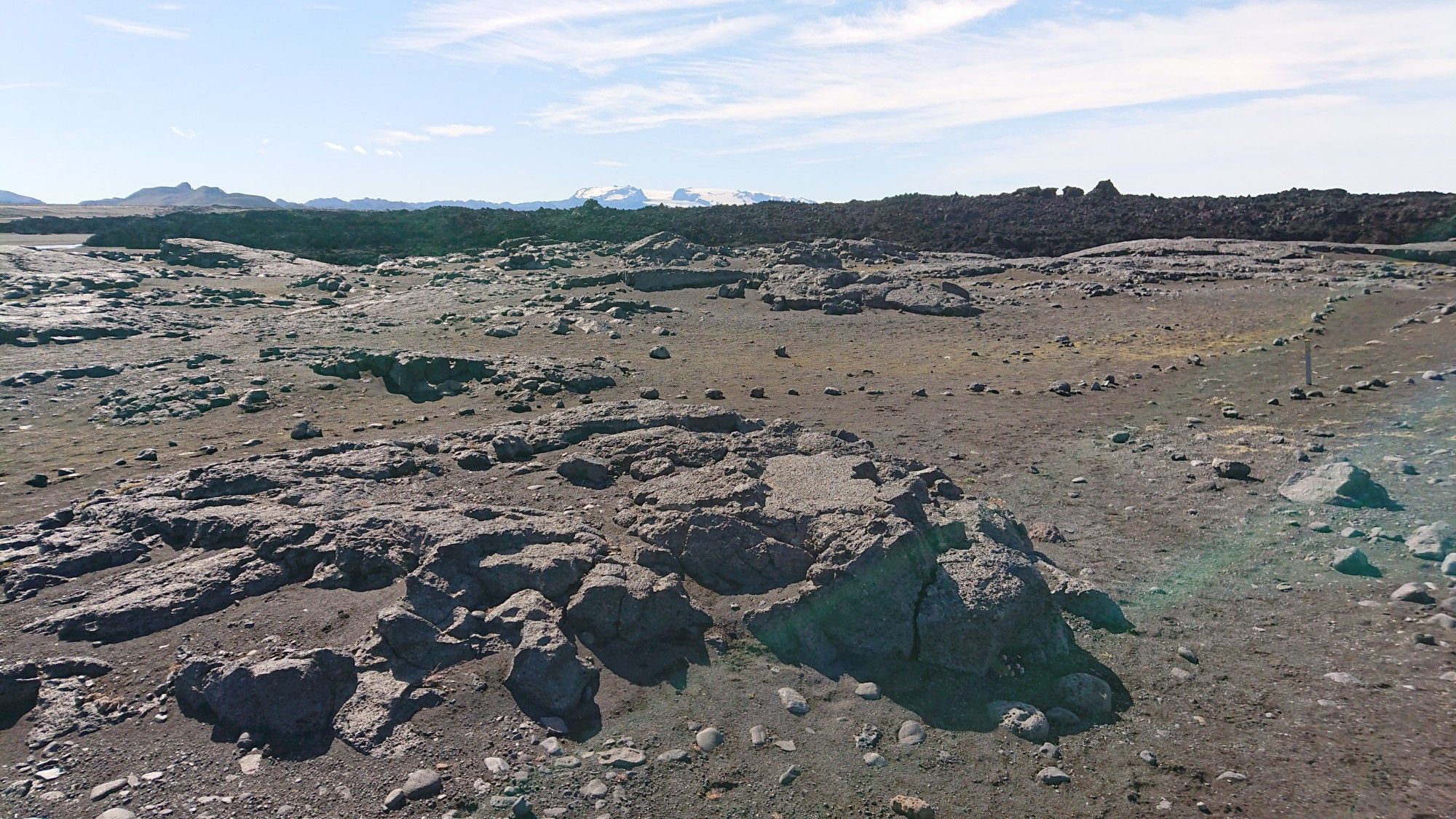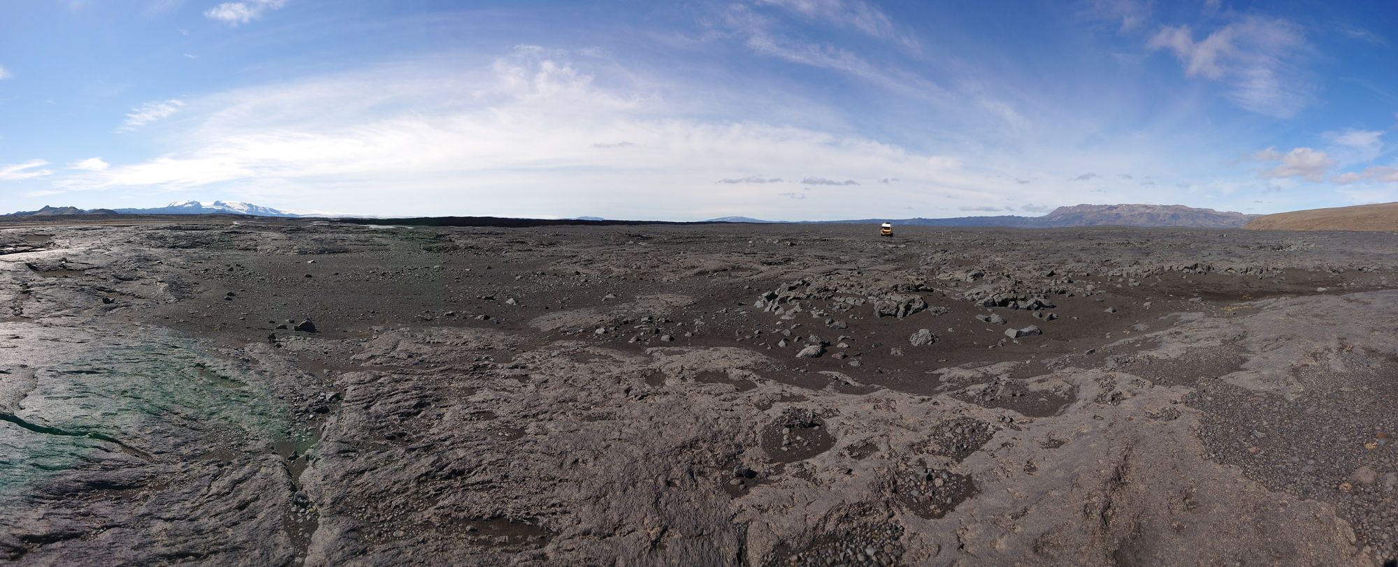 Wir haben dann doch nicht die schwierige Piste nach Süden genommen, da die Flüsse Hochwasser haben. Stattdessen haben wir erst noch das frische Lavafeld von 2014 angeschaut, das also direkt nach unserem letzten Besuch entstanden ist. In Bildmitte sieht man die frische Lawa, am Horizont das Bergmassif Kverkföll.