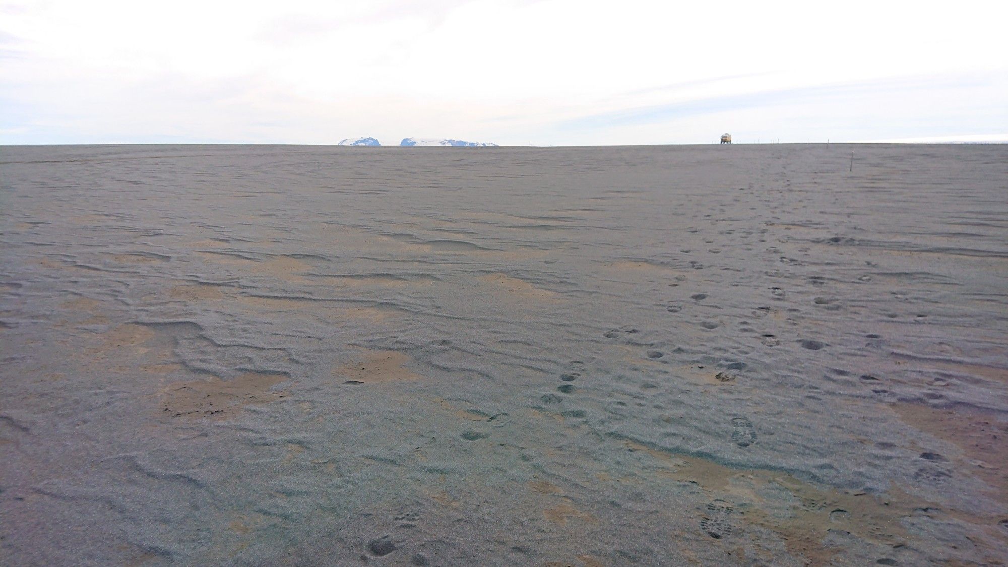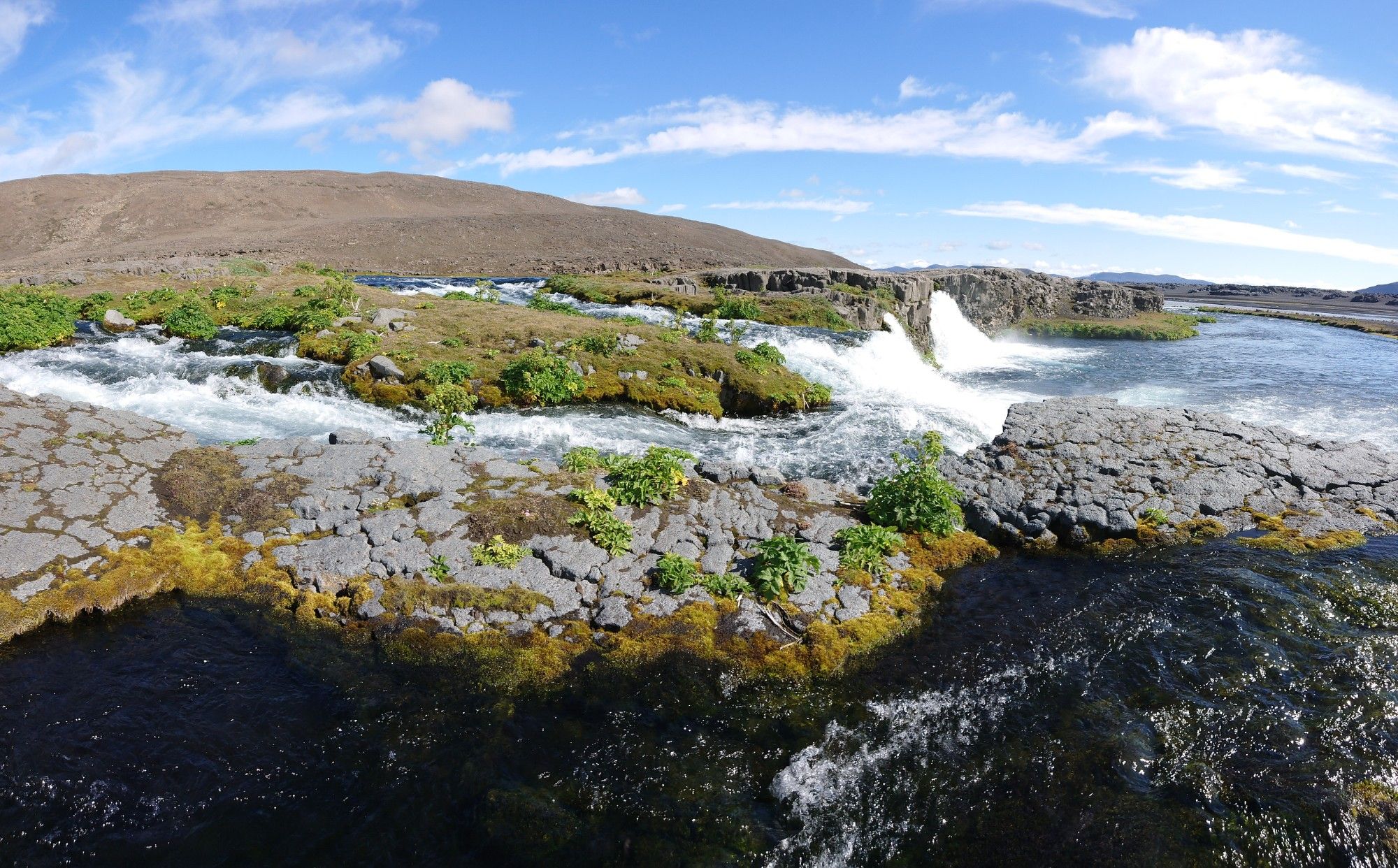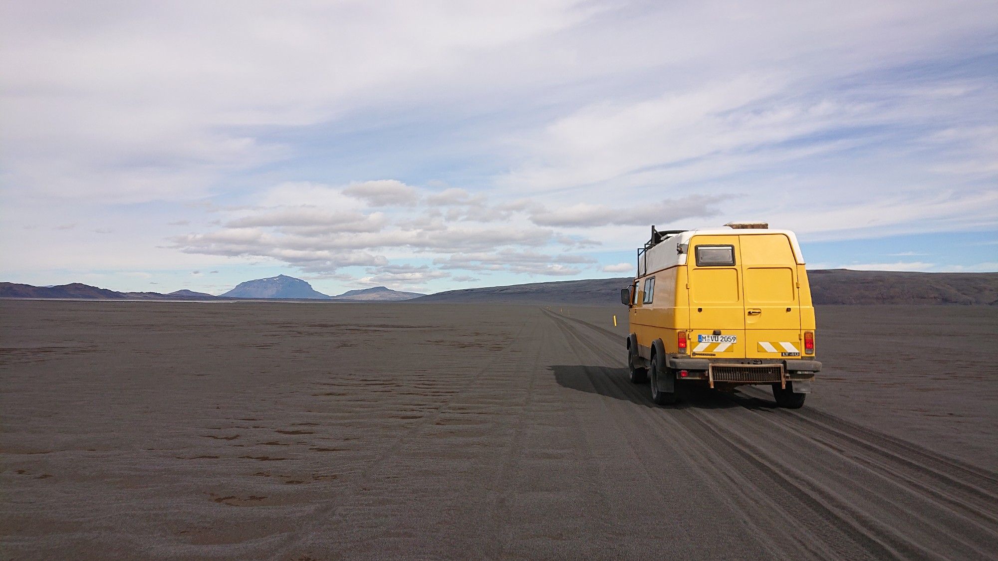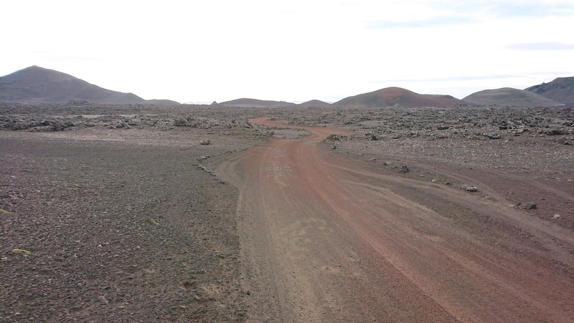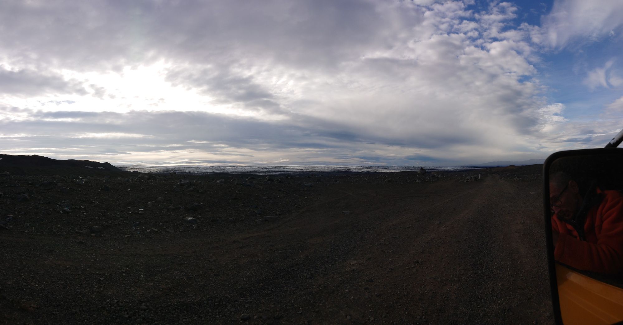 Wir haben dann doch nicht die schwierige Piste nach Süden genommen, da die Flüsse Hochwasser haben. Stattdessen haben wir erst noch das frische Lavafeld von 2014 angeschaut, das also direkt nach unserem letzten Besuch entstanden ist. In Bildmitte sieht man die frische Lawa, am Horizont das Bergmassif Kverkföll.