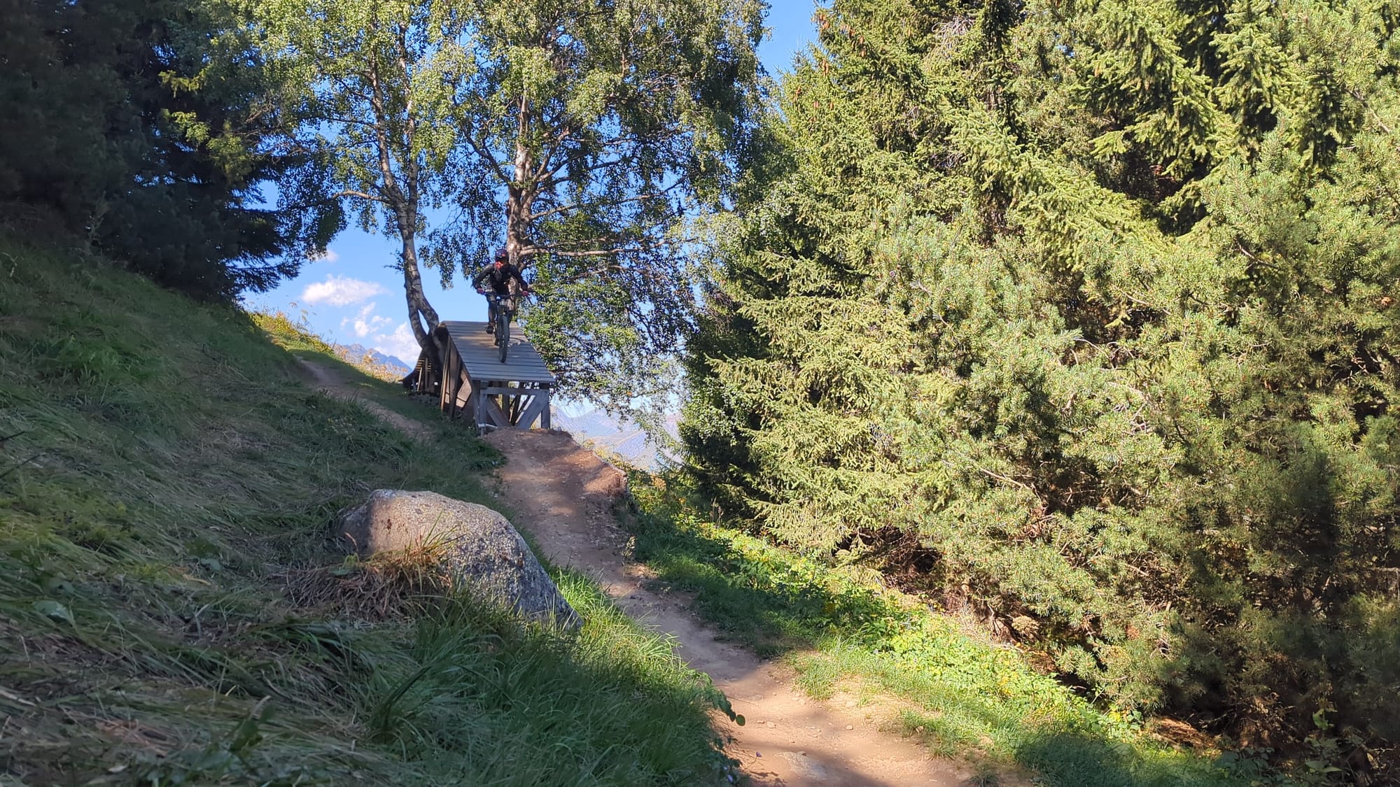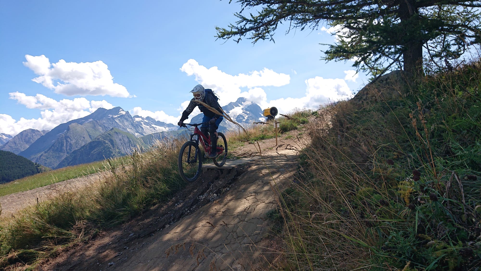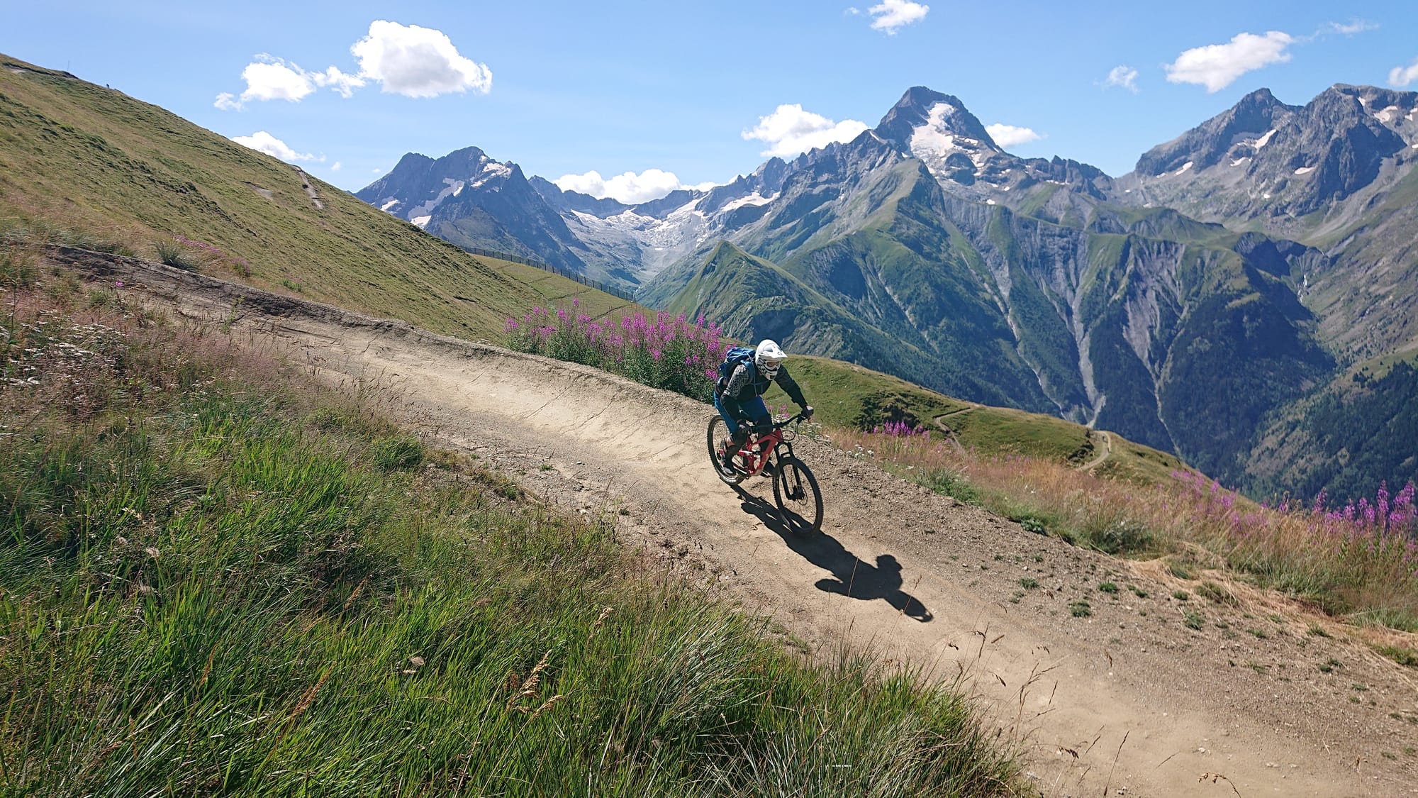 Das Wetter sollte endlich stabil, trocken und sonnig werden. Deshalb sind wir wieder zurück nach Osten ins Dauphiné und nach Les-deux-alpes in den Bikepark. Da startet man auf gut 1600m und hat einen herrlichen Ausblick in die Écrins, wo auch der südlichste Viertausender der Alpen ist.