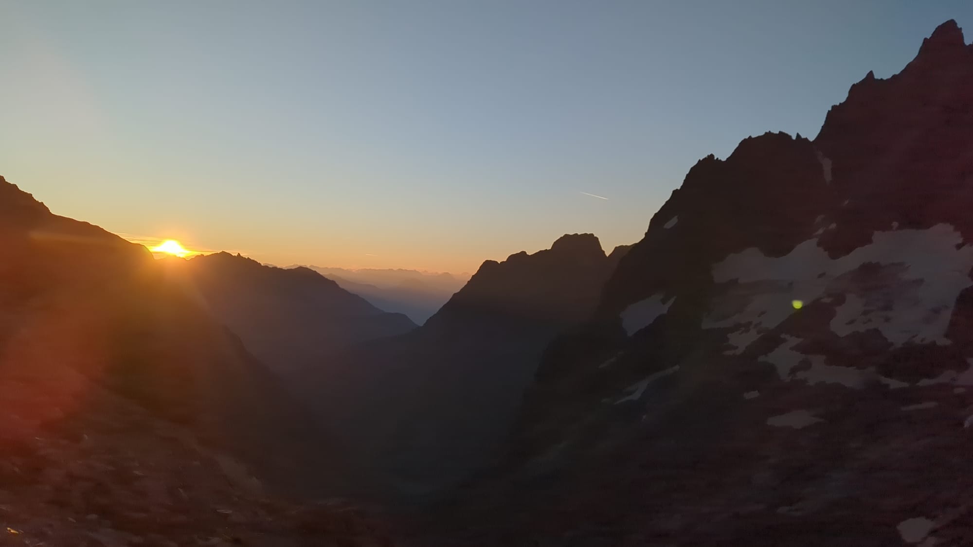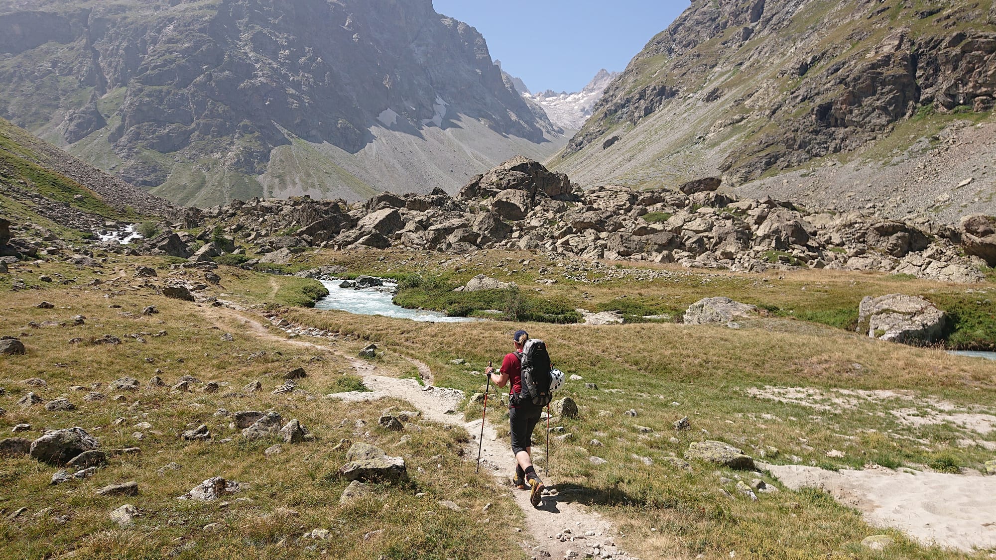 Und für den Tag drauf hatten wir schon eine Nacht auf dem Refuge de Pavé weiter östlich in den Écrins reserviert, wo man in der Nähe von la Grave los läuft. Es ging durch ein wunderschönes Hochtal und man hat super Gletscherblick, allerdings war das ein recht langer Zustieg mit 1300 Höhenmetern und 11 Kilometern. Ganz hinten sieht man unser Ziel: