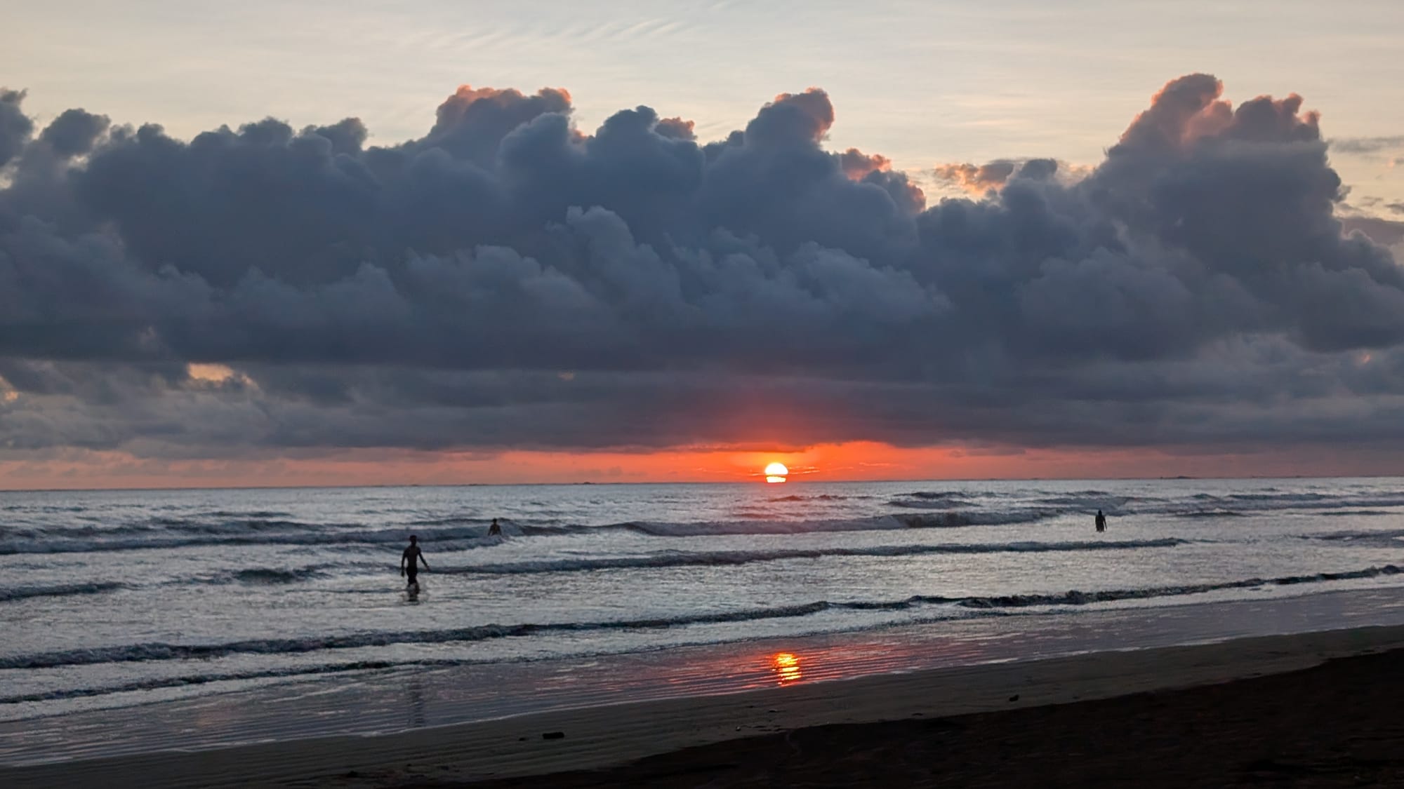 Wir haben dann zwischendurch mal zwei Tage Strandurlaub gemacht. Das Wetter war wieder wechselhaft. Bei einem Strandspaziergang sind wir ordentlich nass geworden.
